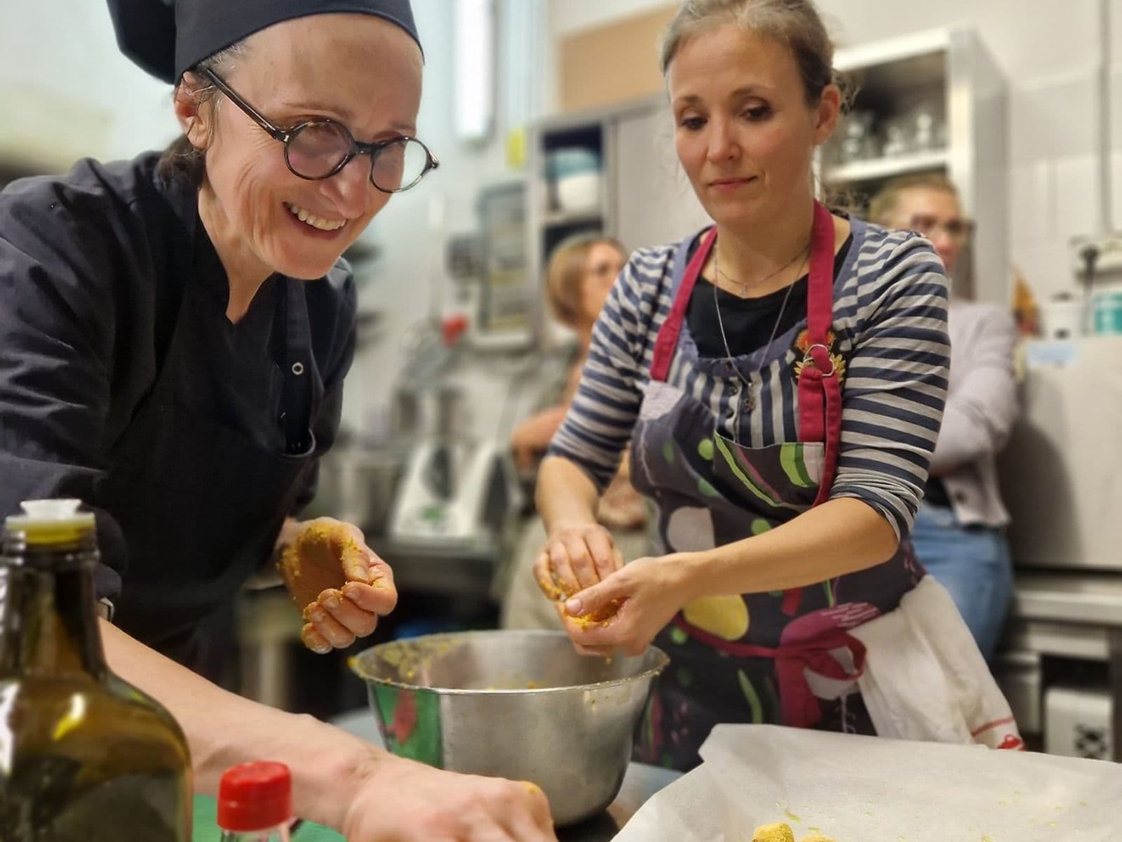 Dopo una breve presentazione della serata nella sala del ristorante, ci trasferiamo tutti nella grande e bellissima cucina, dove si assisterà alle preparazioni. Cristina e Alessandra prepareranno le ricette e i partecipanti potranno contribuire, se vorranno, in alcuni momenti come stendere impasti, mescolare, chiudere fagottini, farcire cestini.