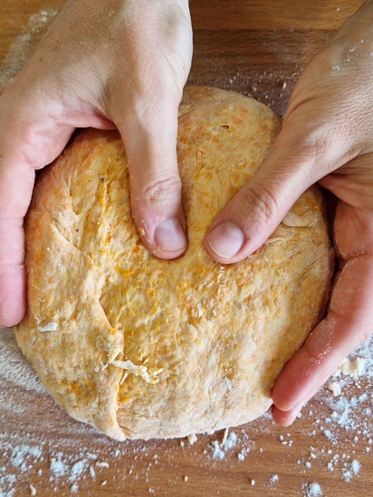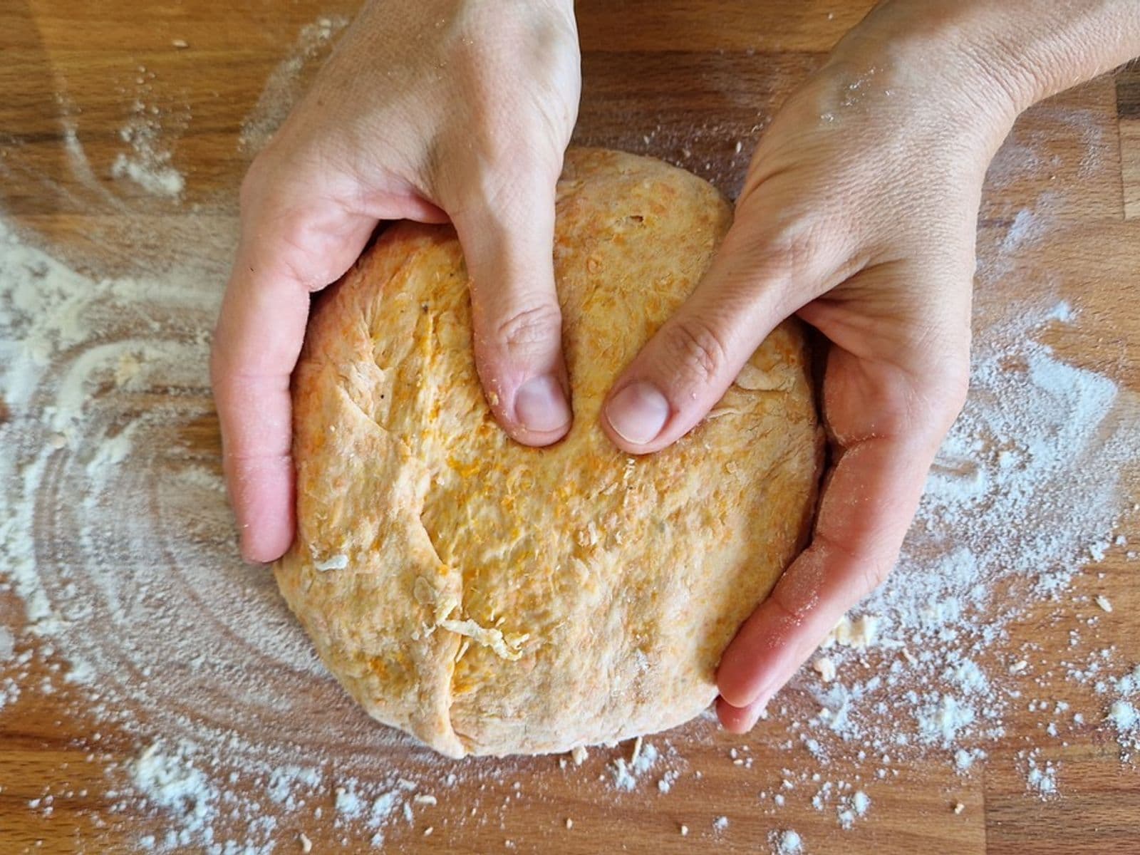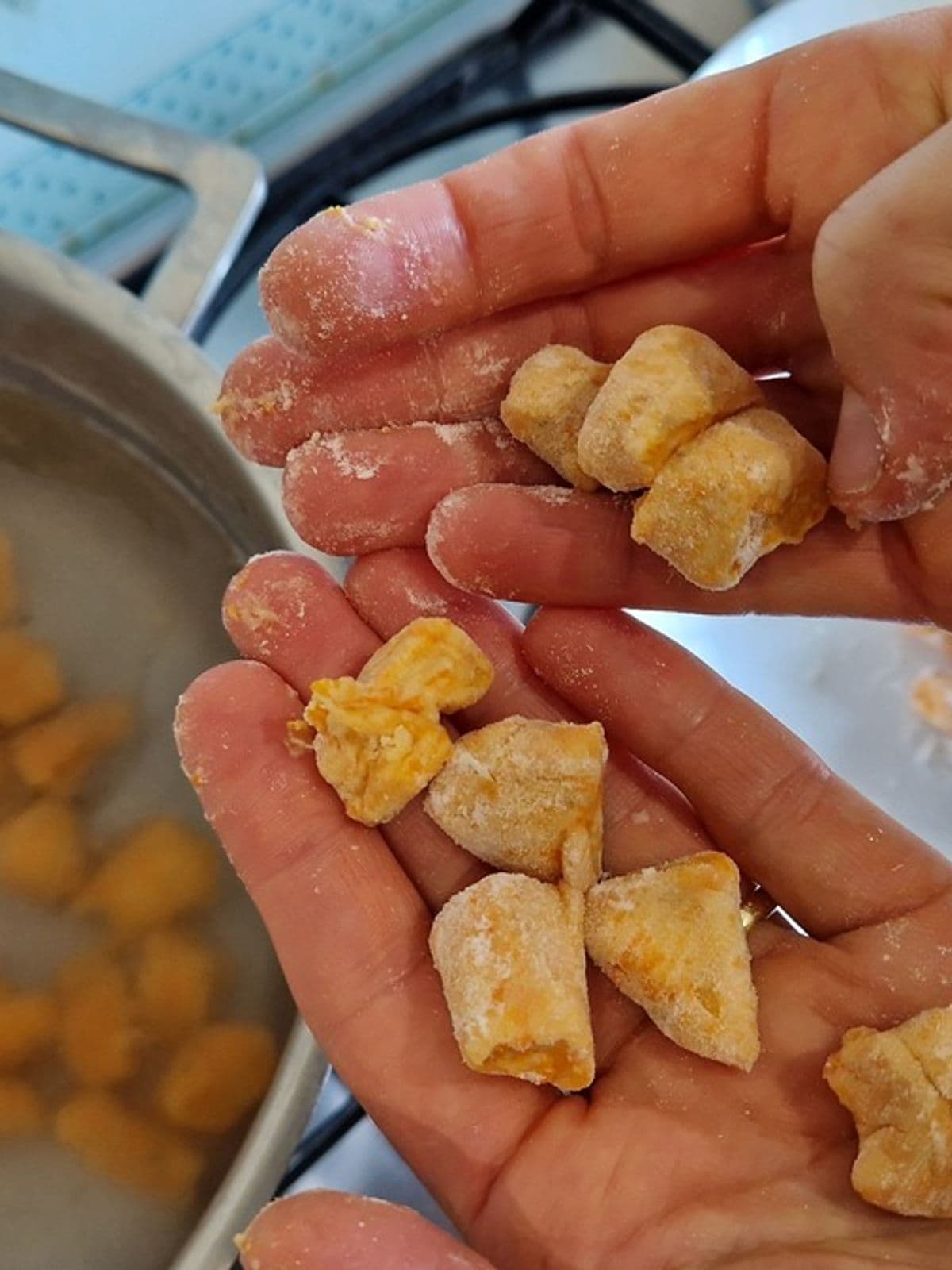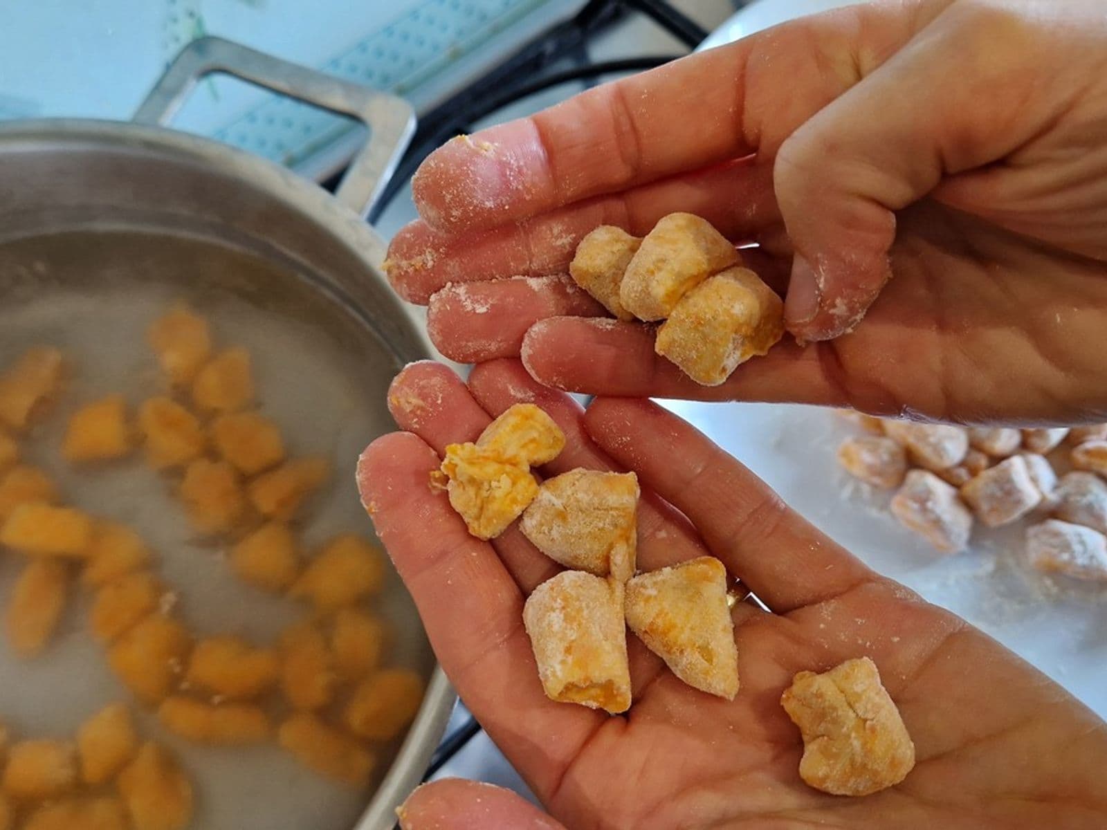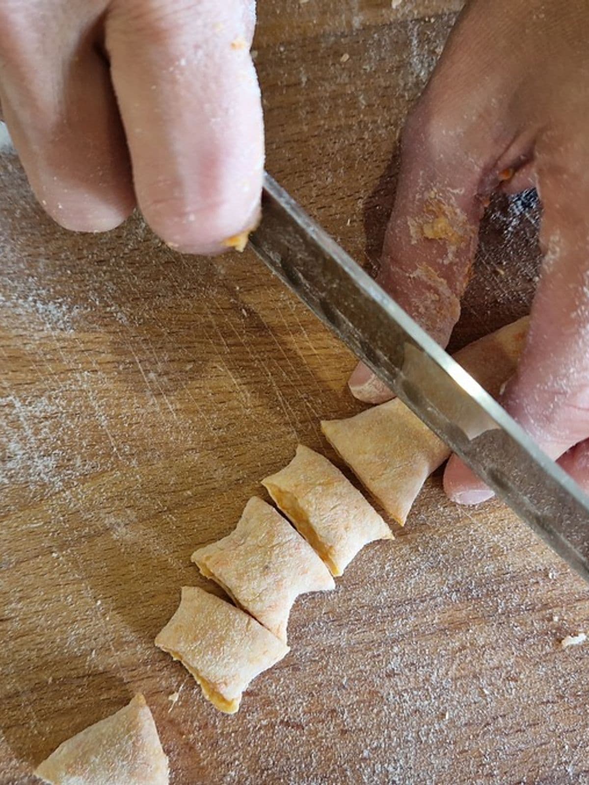 Trasferisci l’impasto su una spianatoia infarinata, dividi in porzioni e forma dei rotolini. Tagliali a tocchetti per creare i tuoi gnocchi di carote. Spolverali con un po’ di farina per evitare che si attacchino.